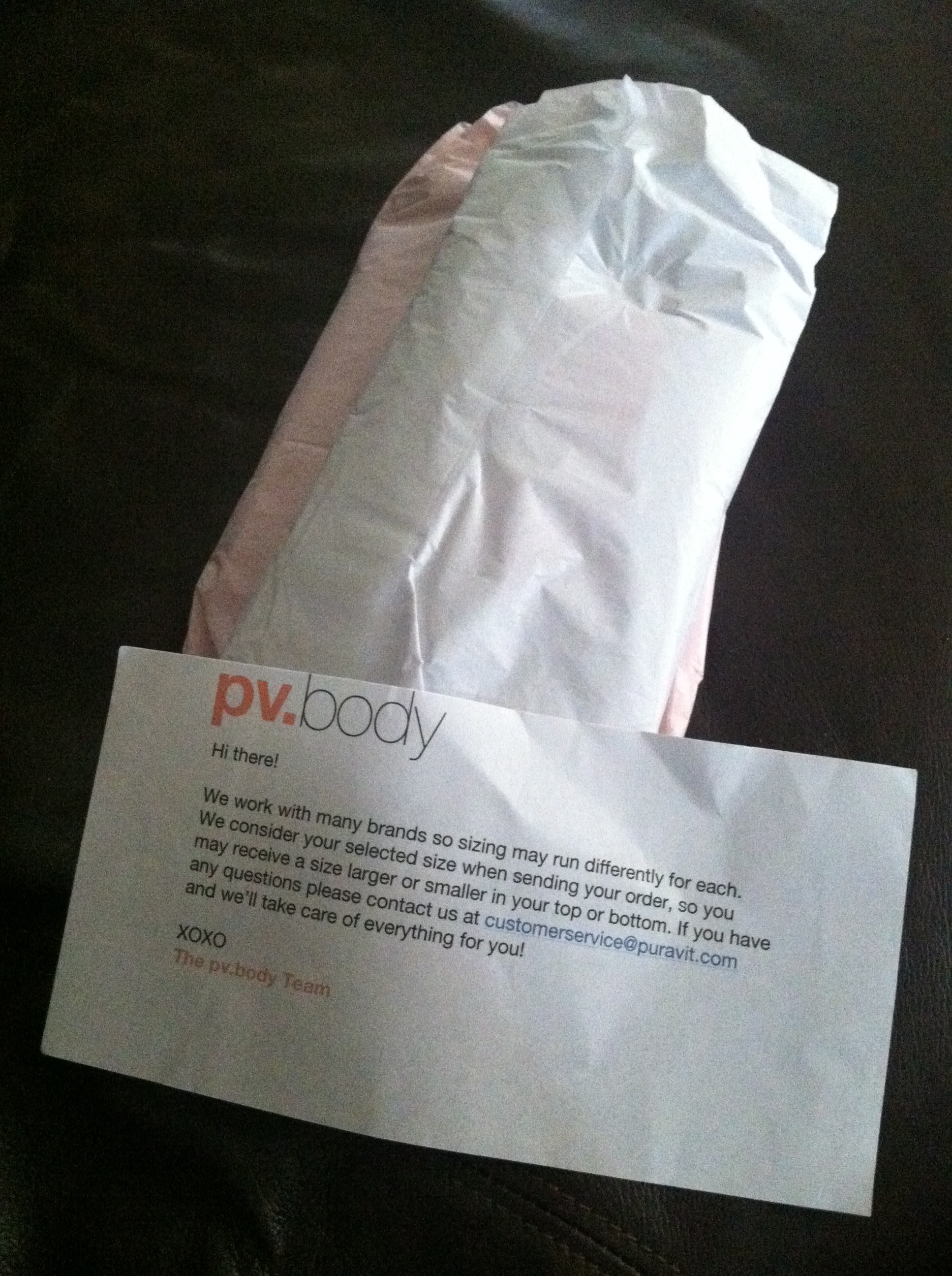 - The presentation – the contents were nicely folded and wrapped in tissue paper – but I was surprised with the note – because it was on plain white computer paper and had been sloppily cut. The bar might be high because I’m comparing this to my experience with Birchbox and one of the things they do so well is presentation. They always include descriptive cards for the products they send, the paper is high quality, and everything is well-designed. Personally, I think the sloppily cut computer paper that was the only note inside the package, cheapened the whole pv.body experience