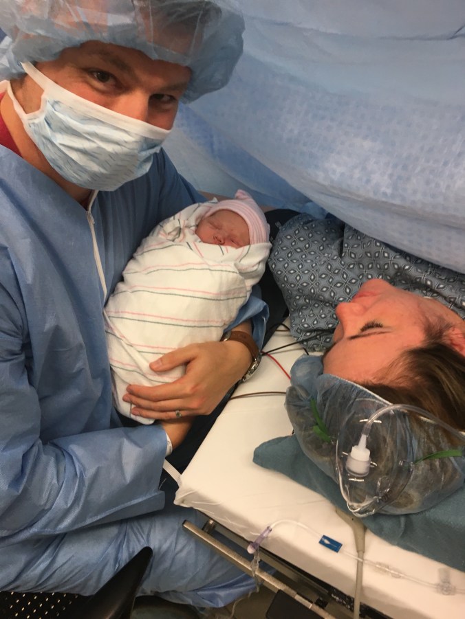 They had Nick get up and go over to the station where they clean her up, weigh her, and cut the umbilical cord. It was weird to know she was “here” but I had to wait what felt like at least 5-10 minutes to actually meet/see her. I wasn’t all starry-eyed waiting for her. I was still shaking and wanted to just get the hell out of the OR. When they finally brought her over – I couldn’t believe how small and cute she was! And thank god – healthy.